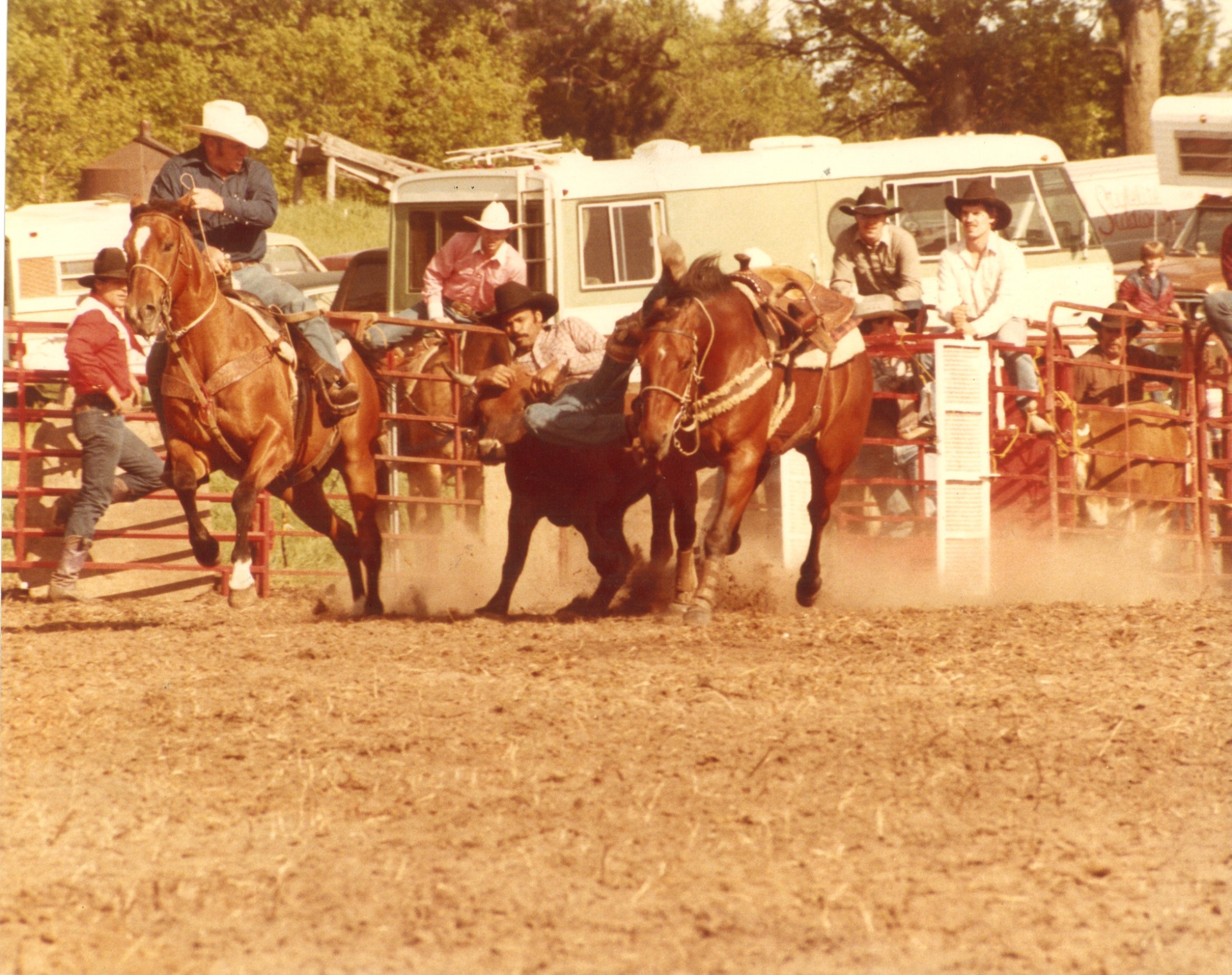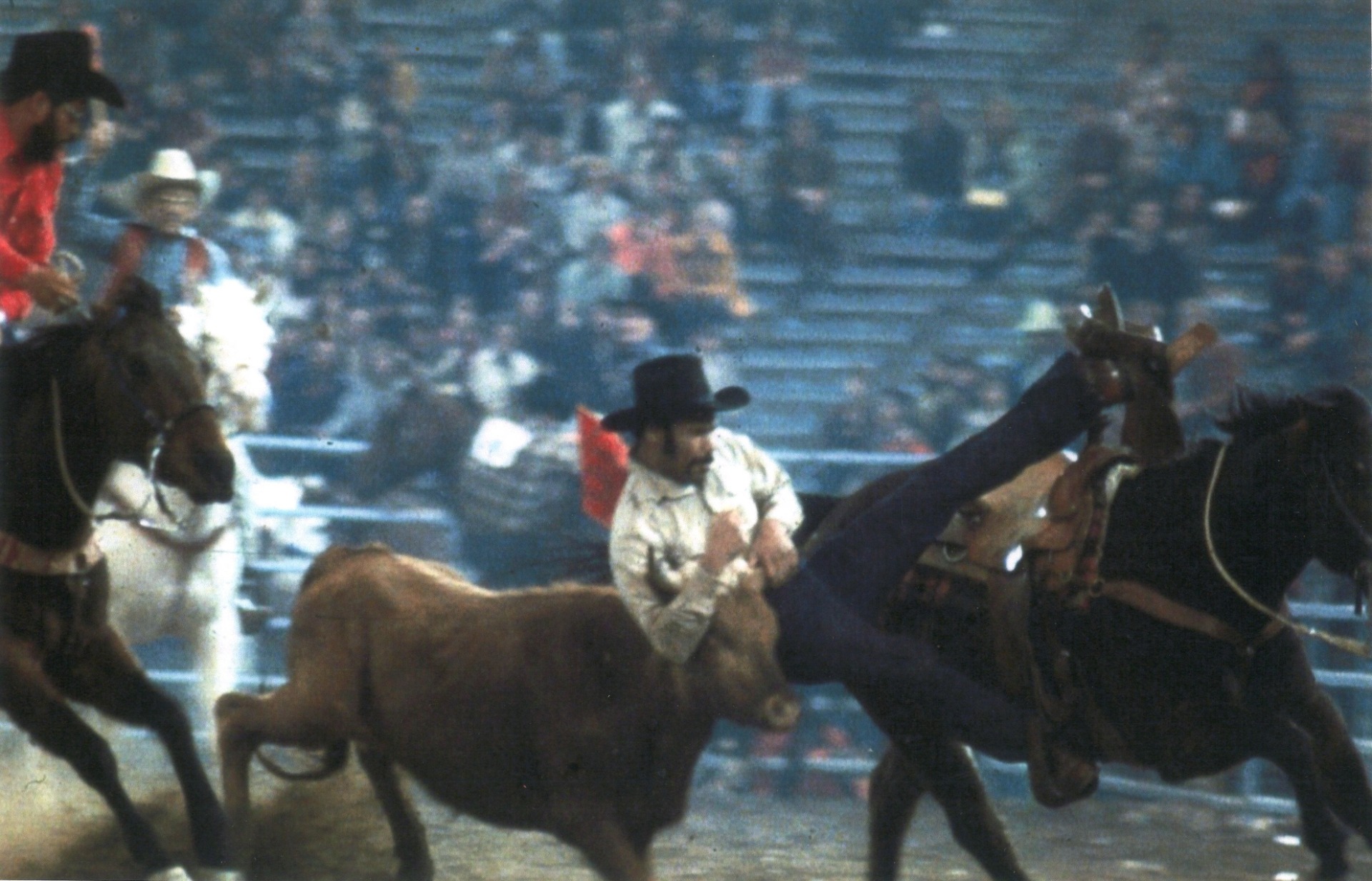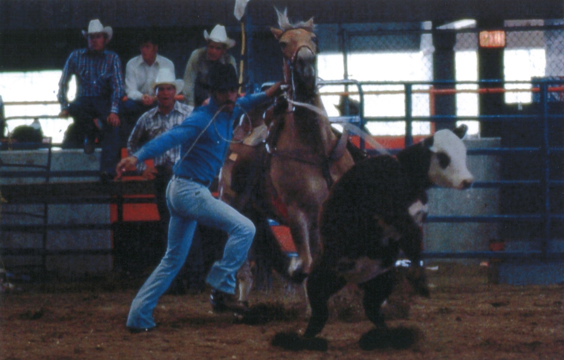 The photographs show Clarence LeBlanc practicing or competing in steer wrestling. Steer wrestling, also known as bulldogging, is a rodeo event in which a horse-mounted rider chases a steer, drops from the horse to the steer, then wrestles the steer to the ground by grabbing its horns and pulling it off-balance so that it falls to the ground. It is believed that the event originated in the 1890s and was started by Bill Pickett, a popular rodeo performer.